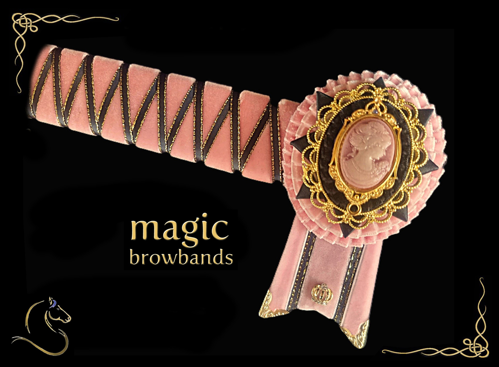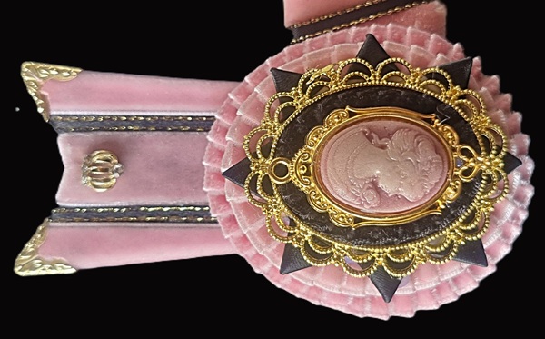 “Aretha” in Dusty Rose, Gold and Black. Shown made up in 15.5″ on 1.25″ band.